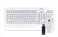 White keyboard & mouse, Black USB receiver, 104-key Keyboard, Optical scroll mouse, Up to 33-feet operating range, Keyboard fold-out feet for comfortable typing, Includes four (4) AA batteries
